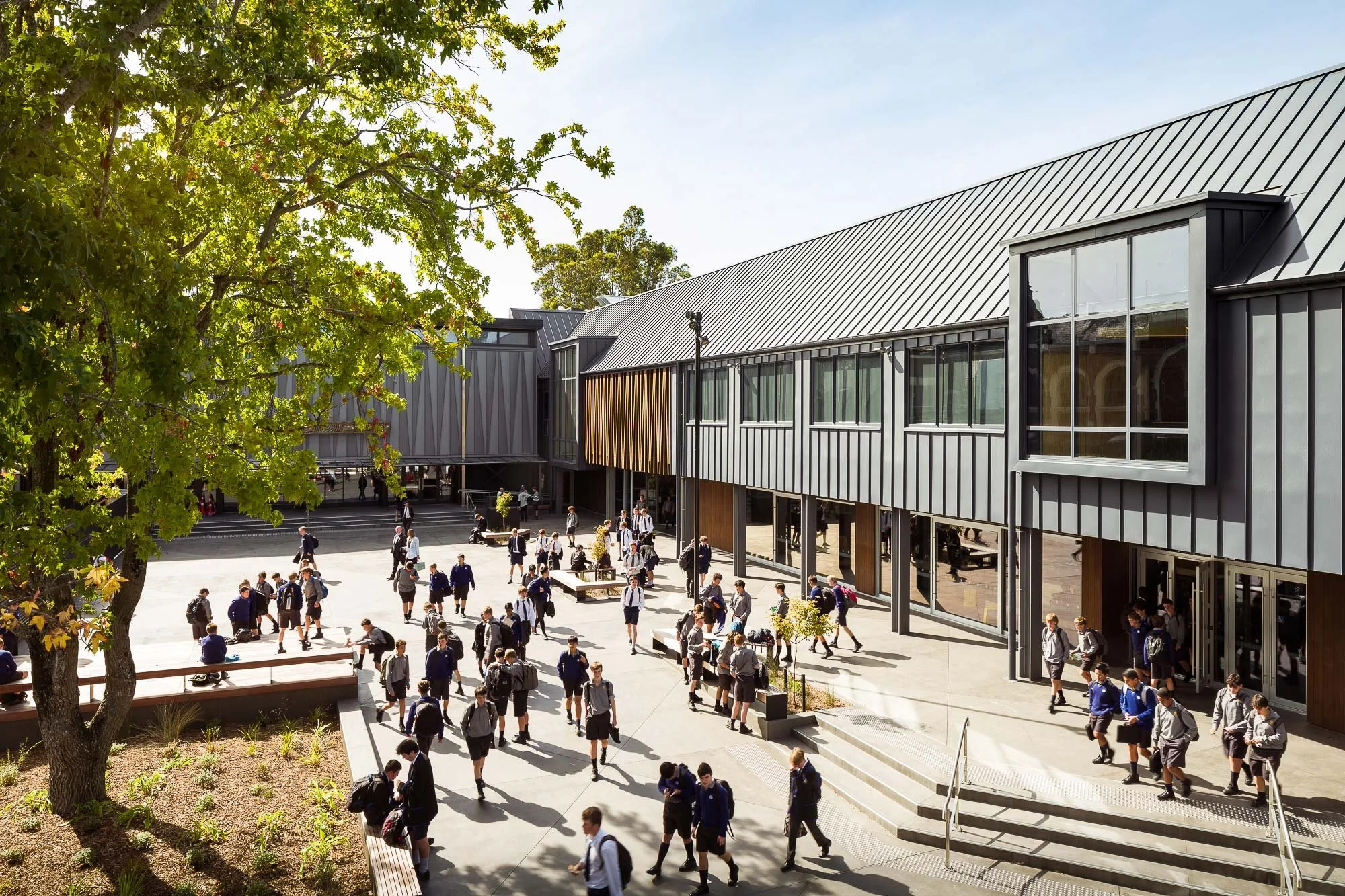 At the heart of the campus is a central quadrangle used for ceremonies, performance, informal gatherings, and outdoor learning, while other outdoor spaces provide places for students to relax and socialise between classes. The landscape design uses robust materials and plantings suited to a busy school setting, with native and riparian planting linking the campus to the Ōtākaro - Avon River.