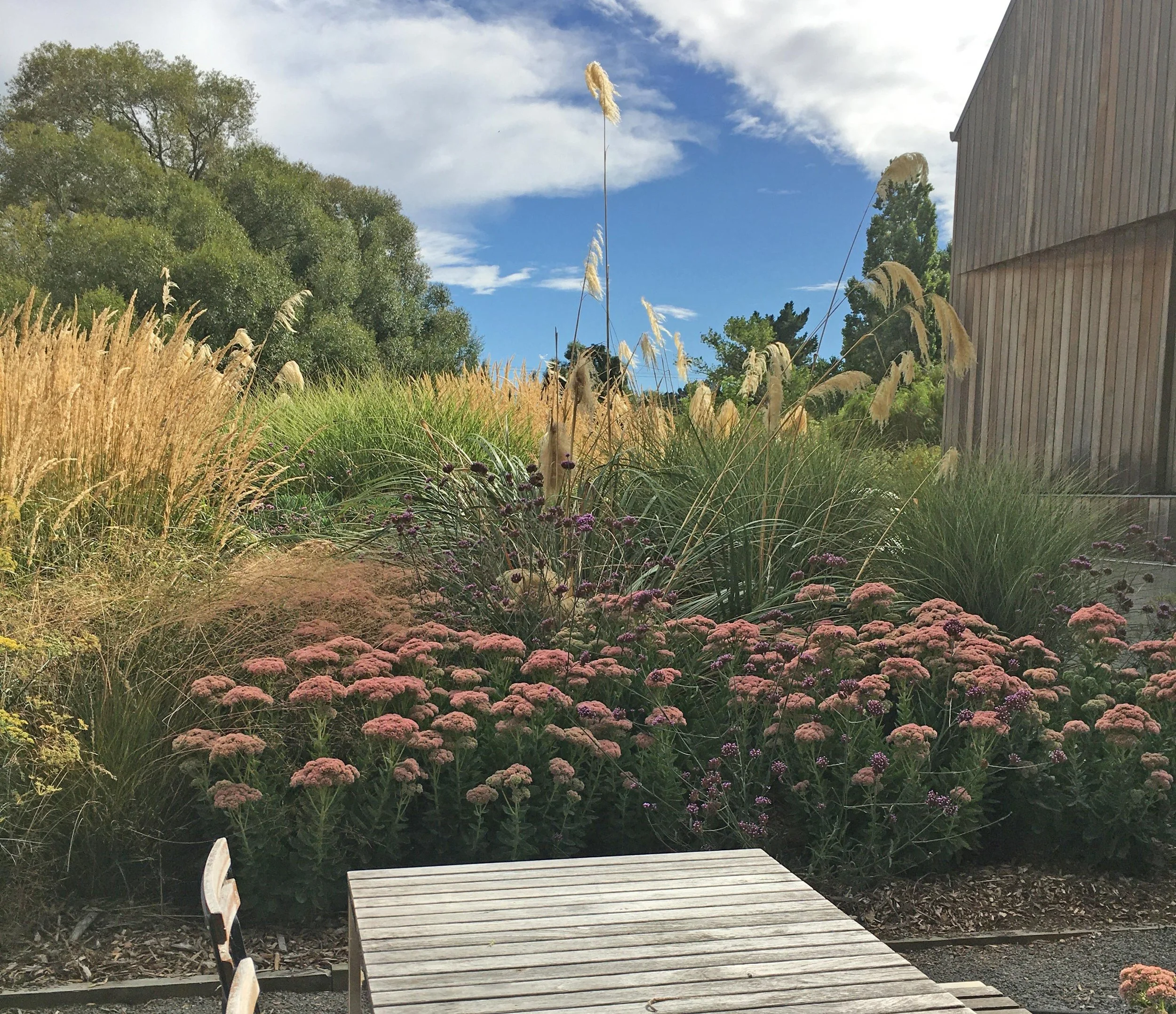Tawny autumn and winter tones blend seamlessly with the adjacent paddocks, while existing macrocarpa along the southern boundary provide a strong evergreen backdrop. An outdoor dining area and hot tub are nestled within the garden, and a newly added swimming pool and deck is elevated above naturalistic plantings.