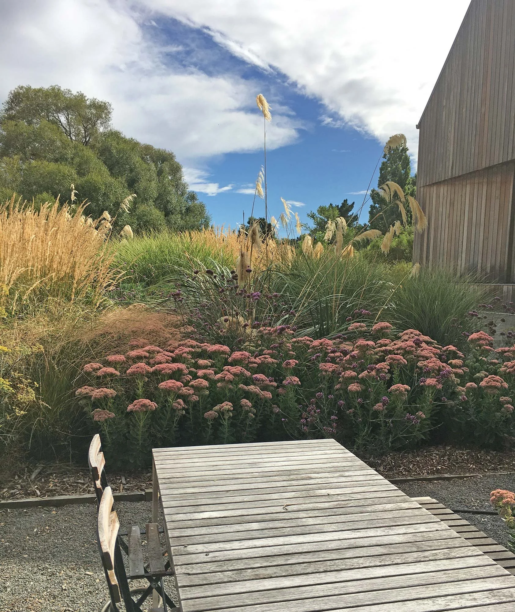 This rural garden is framed by mature trees and the surrounding farmland. A broad lawn extends to an established orchard enclosed by clipped hedging, beyond which looser plantings transition down to the river, planted with a mix of native and exotic waterside species. Tawny autumn and winter tones blend seamlessly with the adjacent paddocks, while existing macrocarpa along the southern boundary provide a strong evergreen backdrop. An outdoor dining area and hot tub are nestled within the garden, with future plans for a swimming pool and expanded naturalistic planting.