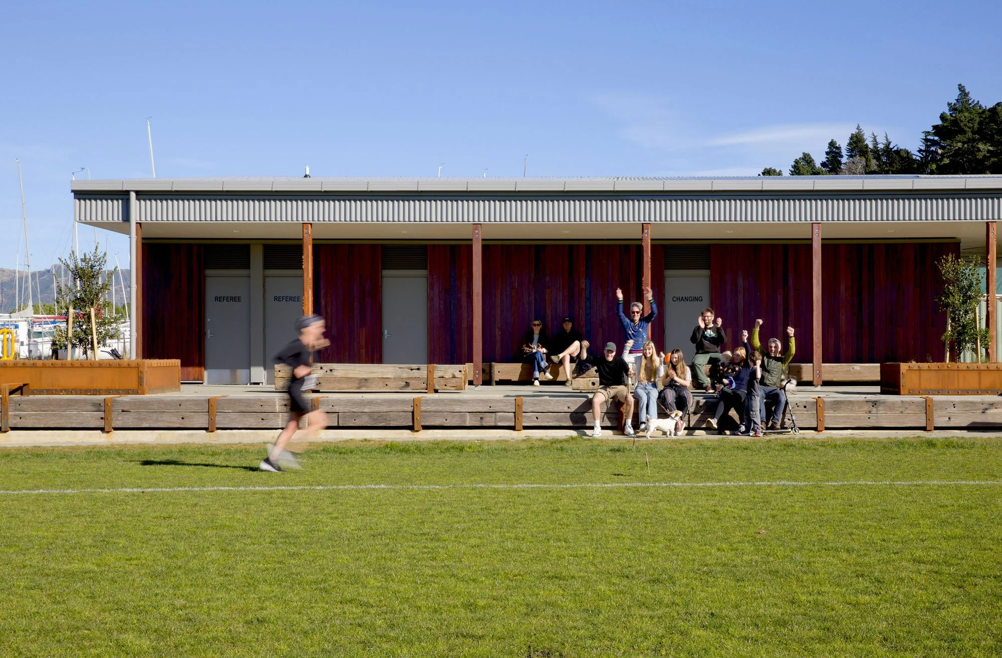 The design draws on the local vernacular, repurposing LPC wharf timbers, using rusticated metals, and yellow handrails that echo nearby tanks. Wharf piles and beams express the original seabed, while the wheke (octopus) inspires a mounded playspace. It is a project designed for the locals, with the locals â people and wildlife alike.